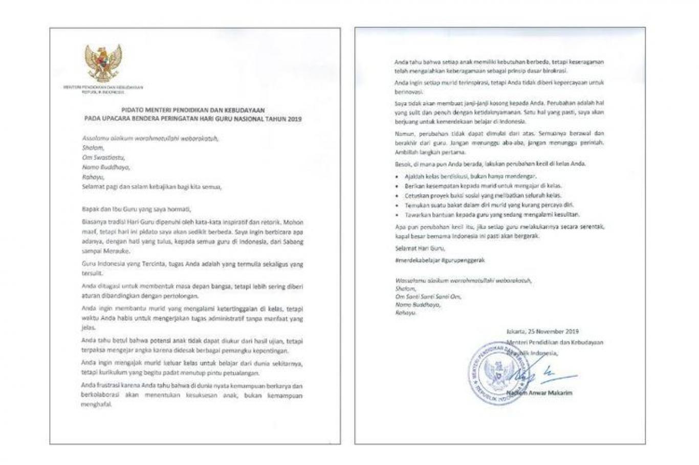 Teks Pidato Mentri Pendidikan Nadiem Makarim saat Hari Guru